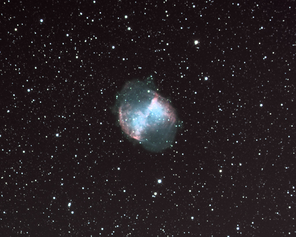 Hydrogen Alpha added to the Luminance for an LRGB image of M27, enhancing the gas envelope.