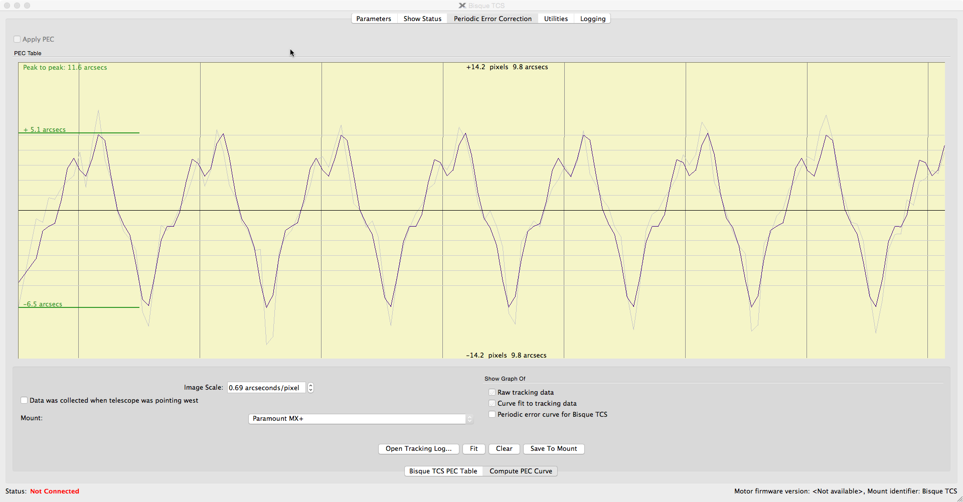 Note that with Periodic Error Correction (PEC) active, the mount tracks at 3.9 arc seconds, which is quite good. However, I think I should work on getting the uncorrected performance into spec.