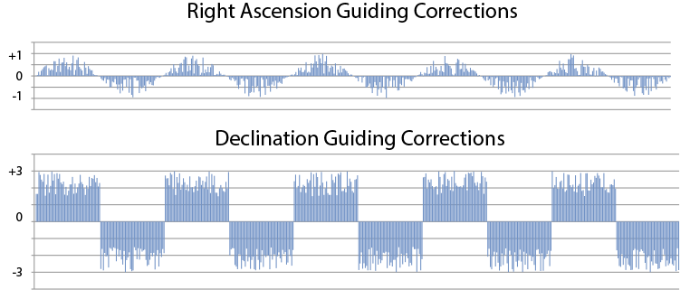 What I’m seeing in Declination is large-scale, slow-period oscillation in the Dec axis. Dec shows as being several arc-seconds off, but multiple successive autoguiding periods don’t seem to be able to correct it. Then it suddenly swings over to being several arc-seconds off on the other side of the axis. At no point does it converge to a “no or small error” state. (This image is a simulation since I forgot to take screen captures the last time I did this test.)